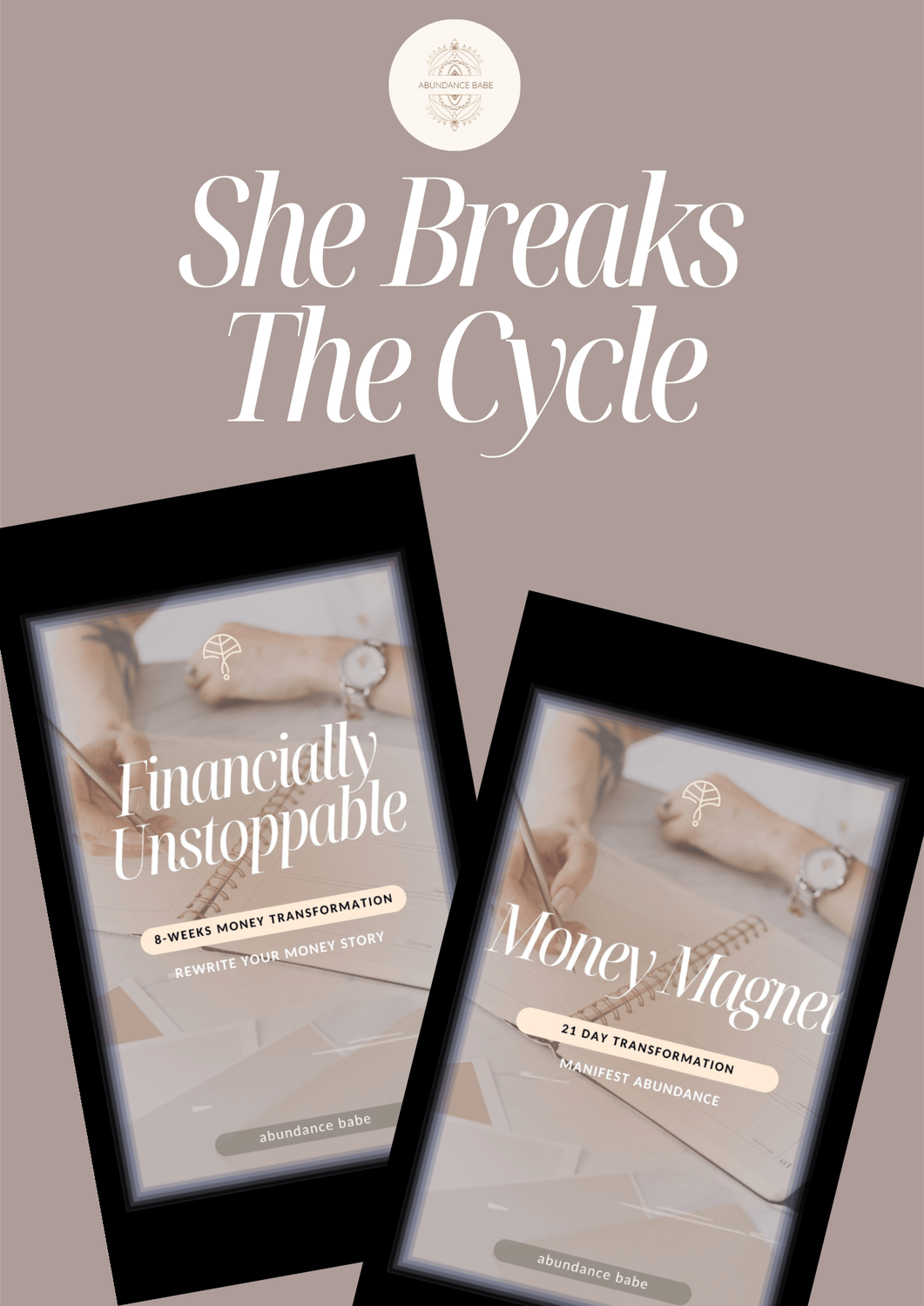 She Breaks the Cycle is a transformational journey designed to help women heal their relationship with money, break free from generational patterns, and step into true financial and energetic abundance. This signature bundle combines my two most powerful programs — Financially Unstoppable and Money Magnet — blending practical financial education with deep inner healing.
